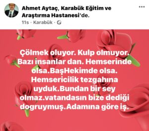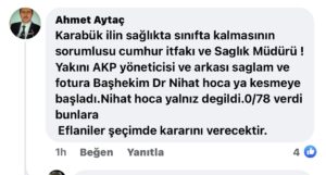 “Karabük ilin sağlıkta sınıfta kalmasının sorumlusu cumhur itfakı ve Saglık Müdürü ! Yakını AKP yöneticisi ve arkası saglam ve fotura Başhekim Dr Nihat hoca ya kesmeye başladı.Nihat hoca yalnız degildi.0/78 verdi bunlara Eflaniler şeçimde kararını verecektir.” yorumunda bulunmuştu.